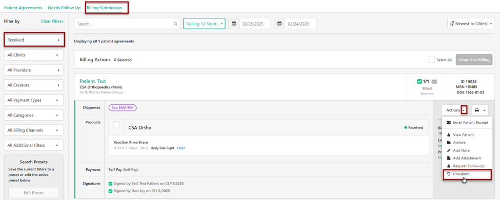 A user with the Admin Role can Unsubmit a billed Patient Agreement from the Billing Submission page. In the Expanded PA view the UnSubmit option can be found under Actions by selected the drop-down menu. On a Billed/Received PA the UnSubmit is visible on the Billing Status bar at the top of the claim.
