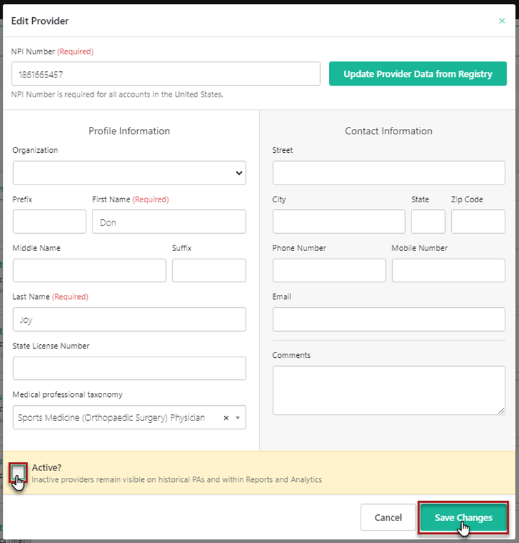 Uncheck the Active box. Select Save Changes to inactive the provider.