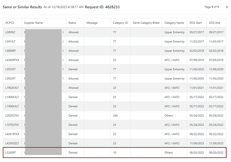 The Same or Similar check can only be completed for one product + HCPCS code combination. It is set to only check the first product/HCPCS code on the PA. If a patient is receiving both an L and an E code product, add the product with the L code to the PA first. If there are two L code products, the results will provide PASS/FAIL for the first product only. The second L code product would need a manual review to determine PASS/FAIL.