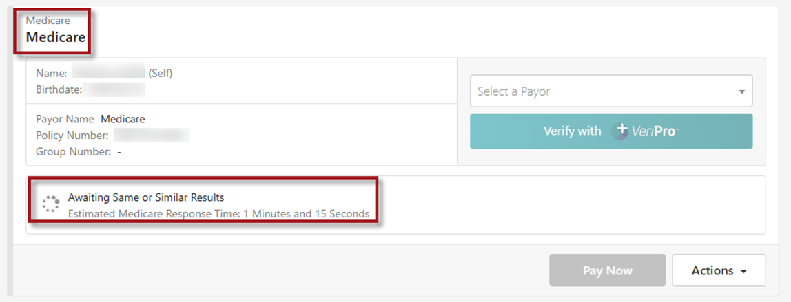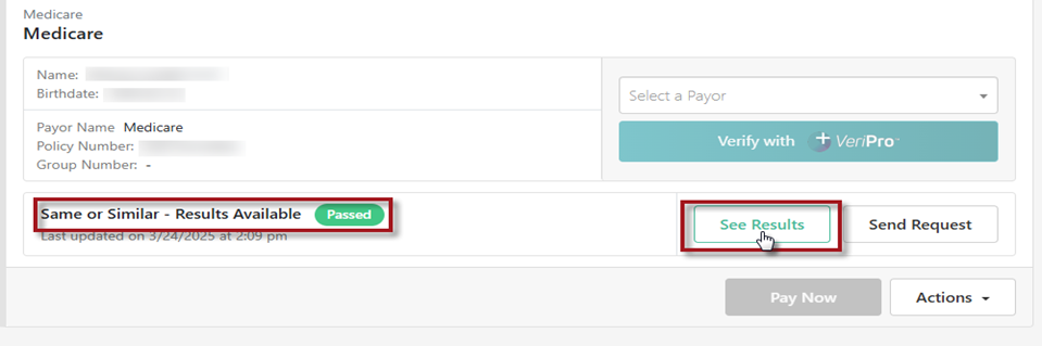 To correct the patient name or DOB, Edit the Medicare Payment Method, update the patient name or DOB and Save. Click the Send Request button on Same and Similar to rerun the check.