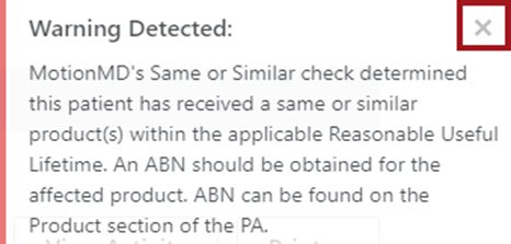 When the result is a FAIL and there is No ABN attached, an option is available to display an Early Warning box. The alert assists users to identify a claim needing an ABN due to a FAIL. The ABN can be found on the product section of the PA. Clicking “x” clears the warning.