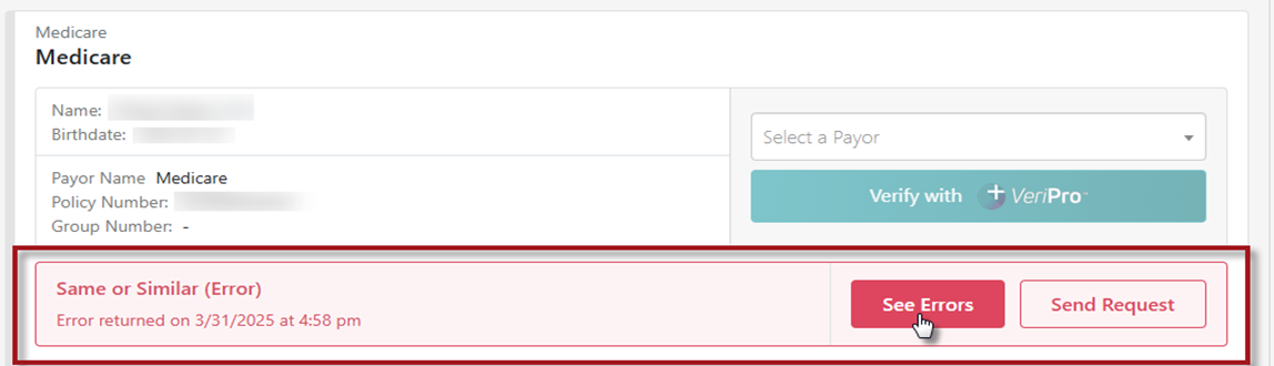 When the Error modal opens, if the reason is State Code is Missing, Edit the Medicare Payment Method, add the 2-character State Code under the Policy Holder section and Save. Click the Send Request button on Same and Similar to rerun the check.