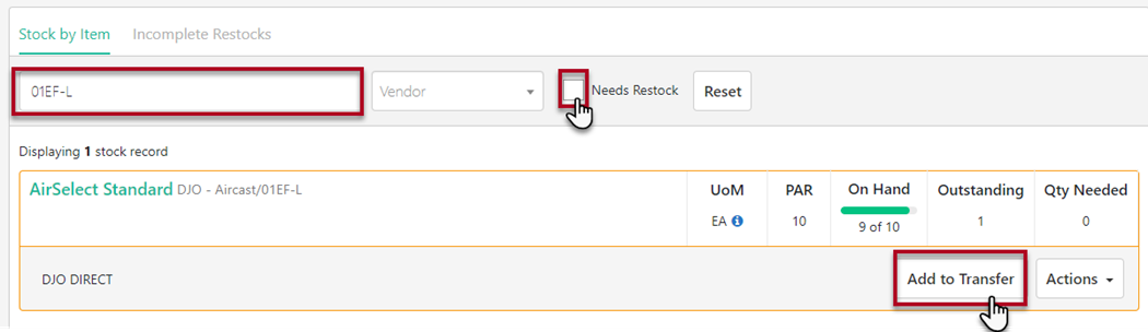 In the search bar type the SKU(s) of the product(s) that are being transferred and unselect NEEDS RESTOCK to search all inventory in stock. Once SKU(s) are selected, click ADD TO TRANSFER and a side bar will open up.