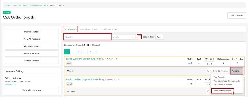 Under the Stock by Item tab use the search field. In the search box unselect the box that says Needs Restock and type in SKU or Product name. This will pull all products matching the search criteria. Locate the SKU and select Actions to Update Stock Record.