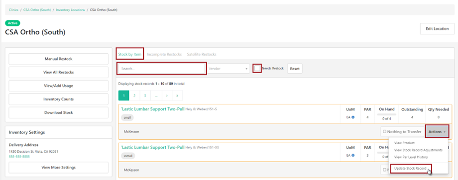 Under the Stock by Item tab use the search field. Uncheck the Needs Restock option and type in SKU or Product name to search all inventory. Locate the SKU and select Actions > Update Stock Record.