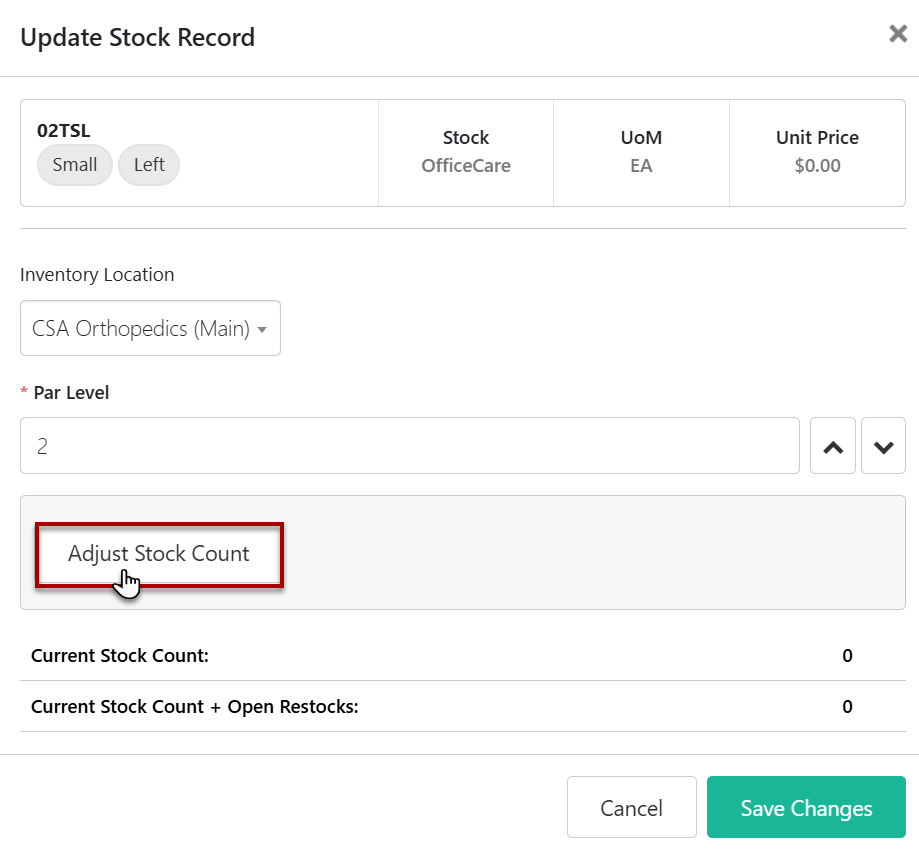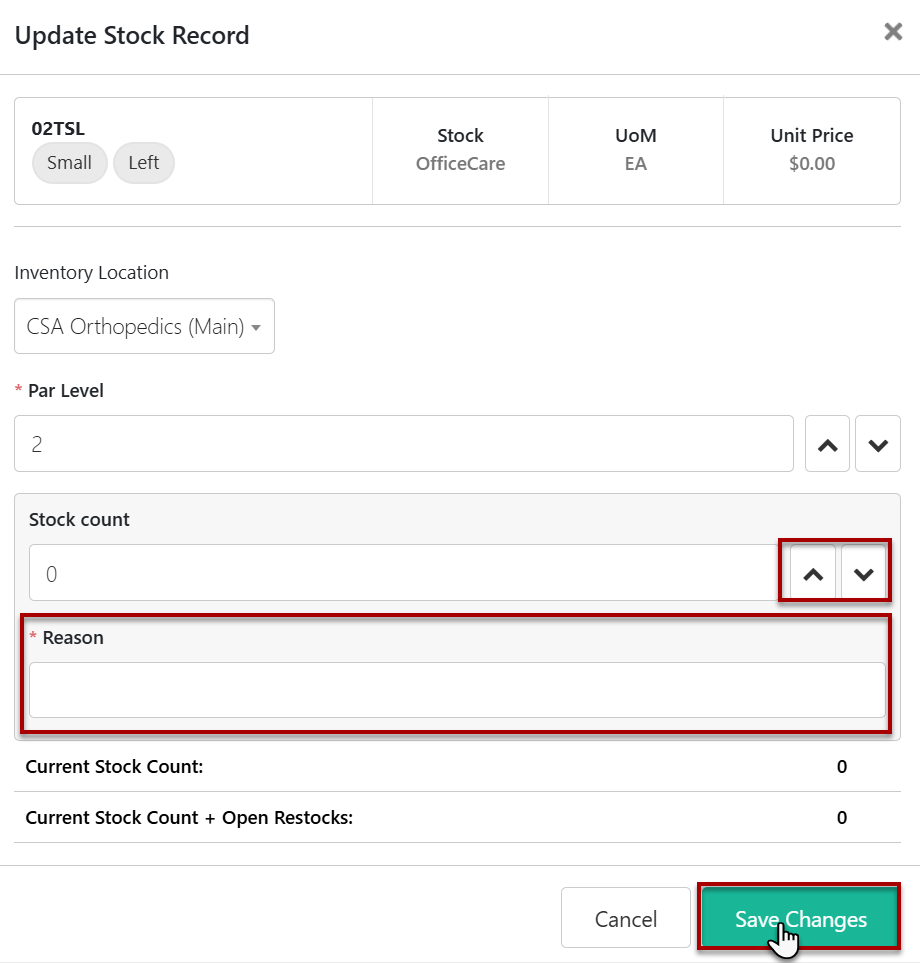 The system opens the Update Stock Record box. Select the Adjust Stock Count button. A second box will open up where the user can Increase and/or Decrease On Hand counts by selecting the up or down arrow. The reason for the adjustment is a required field to complete prior to Save Changes.