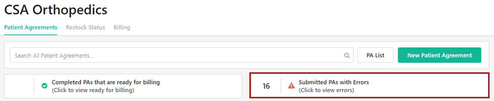 A patient agreement (PA) may error due to an occurrence downstream, resulting in an error message indicating the PA did not get to its intended destination/location. Users can view and manage patient agreements in Error Status on the main dashboard.