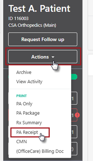 On the PA Page, select the Actions drop-down on the left-hand side of the PA page. Once selected, a drop-down box will appear. Select the PA Receipt option.