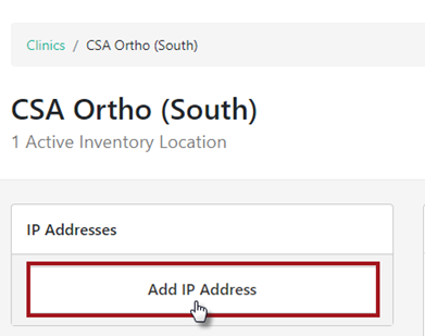 Add IP Address to Clinic(s): Click on the Clinic Name and the Add IP Address button