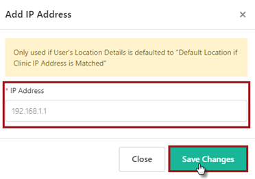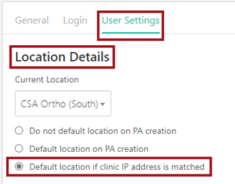 Link IP Address to User Profiles: In User Settings tab within the user’s profile, select Default location if clinic IP address is matched and Save Changes.