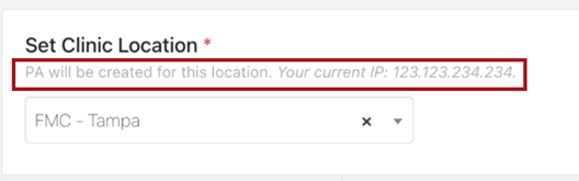 Once set, when creating a NEW Patient Agreement, a message will display indicating the PA is being created for the selected location along with the current IP address.