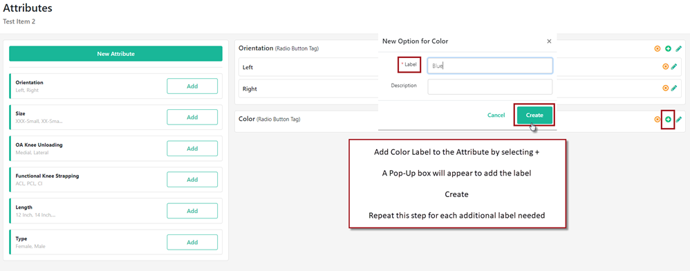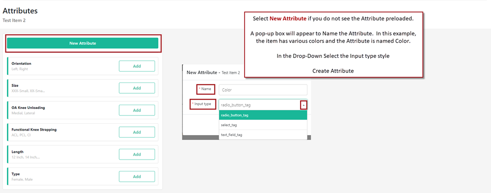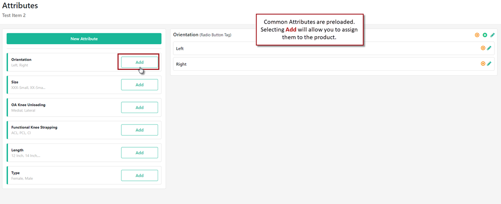 Multiple attributes may be set if there are more than one descriptor for a SKU (i.e. Left, Small). If a product has no distinguishing attributes for the SKU, this step may be skipped: