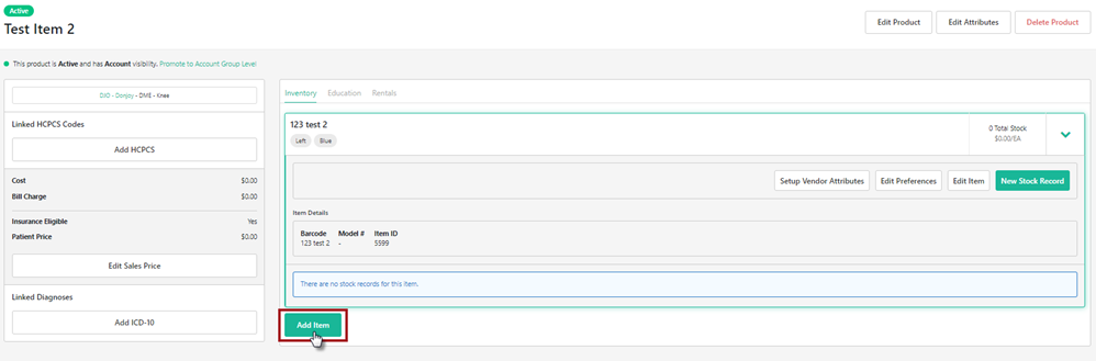 Once created, users are defaulted to the page to set stock records. Select Add Item to create additional SKU’s. Repeat as necessary.