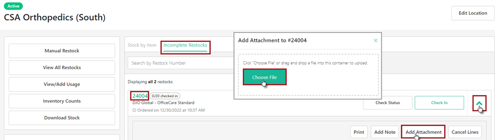 A user has the ability to upload an attachment to a restock order that has been placed in MotionMD. If necessary, multiple attachments can be added to the same order.