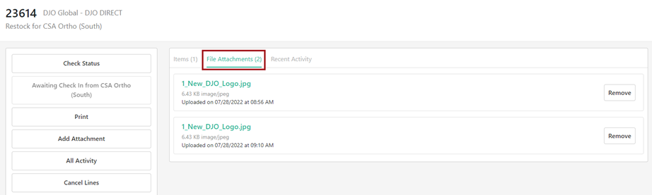 The attachment(s) will auto populate onto the order and are available under the File Attachments tab when viewing the restock order.